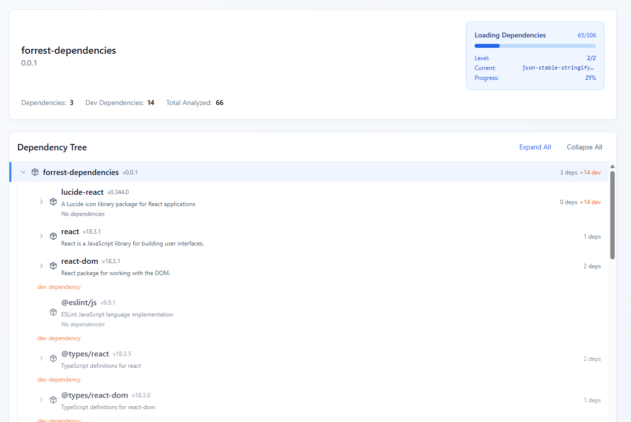 Forrest is implemented in React. All operations are executed entirely on the frontend. To resolve dependencies, the application spawns web workers that asynchronously fetch the required data in the background and return the results to the requesting worker.
