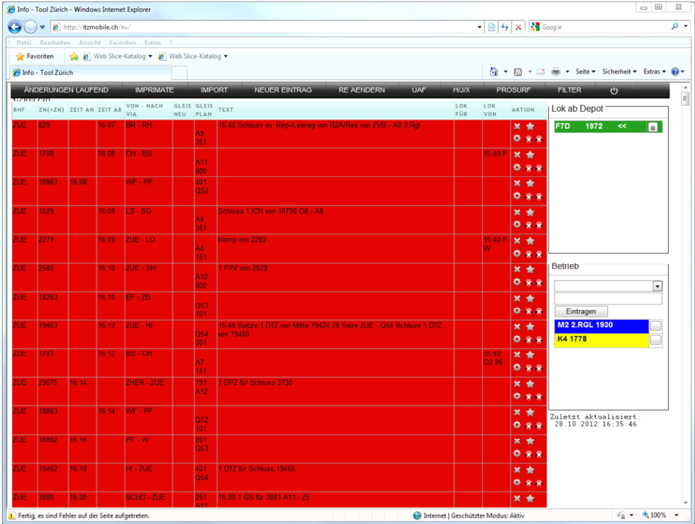 While working as a Train Controller at the Central Interlocking in Zurich in 2011, I was assigned a project called Info Tool Zurich. The software was developed in PHP and jQuery. Its main purpose was to inform everyone working at Zurich Main Station—both with and on trains—about changes to the yearly schedule occurring that day.