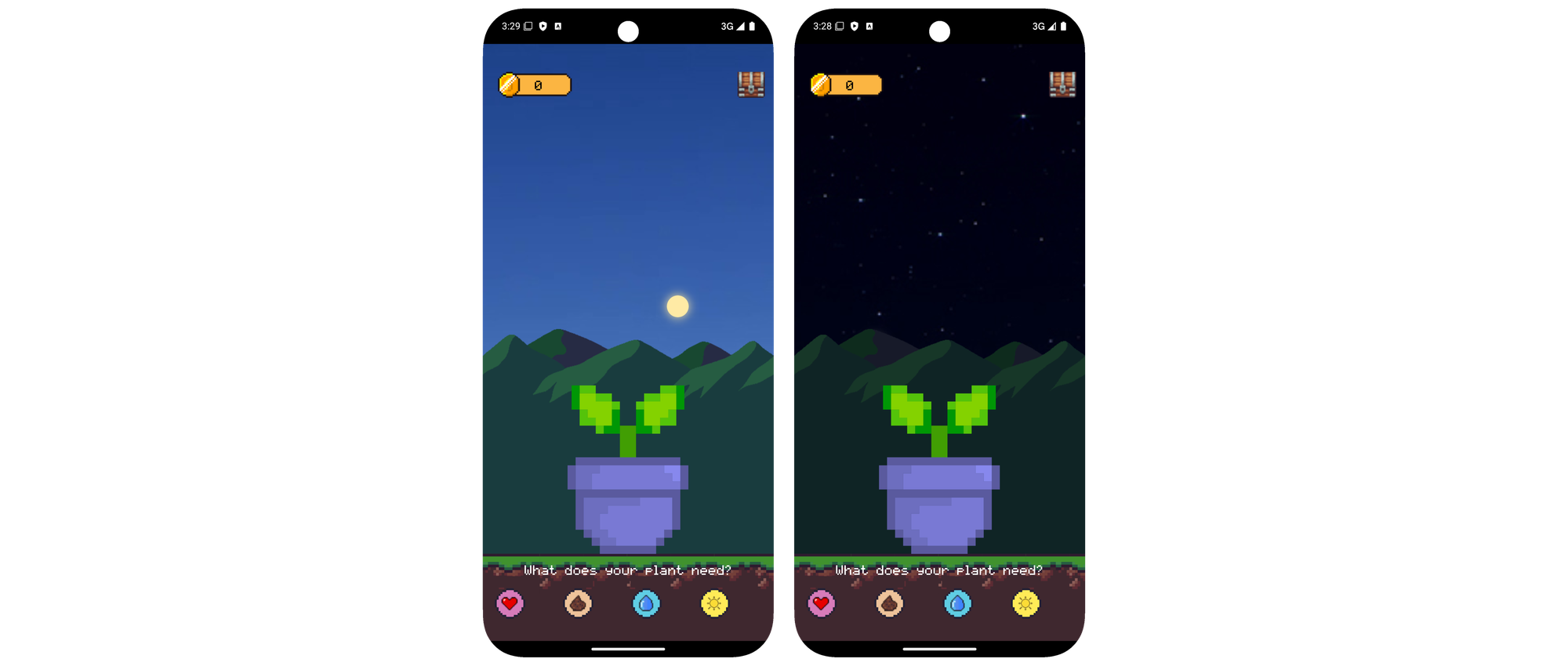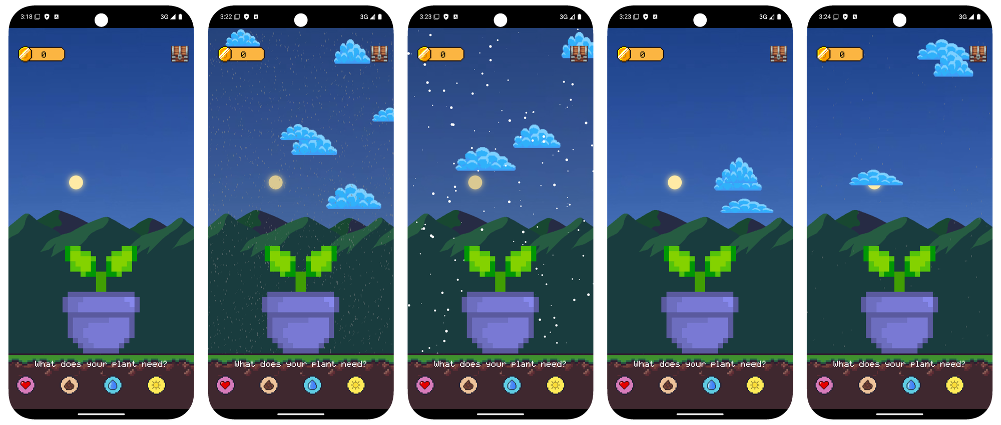 The Weather and Time have a direct impact if the user needs to give fertilizer or water the plant. Also the user should not forget to expose the smartphone to direct sunlight. We measure with the brightness sensor how many lux currently come in and then we set the daylight counter. If any of the 4 stats drops below a threshold, the plant begins to wilt unti lit dies. If you perform well, the plant will grow.